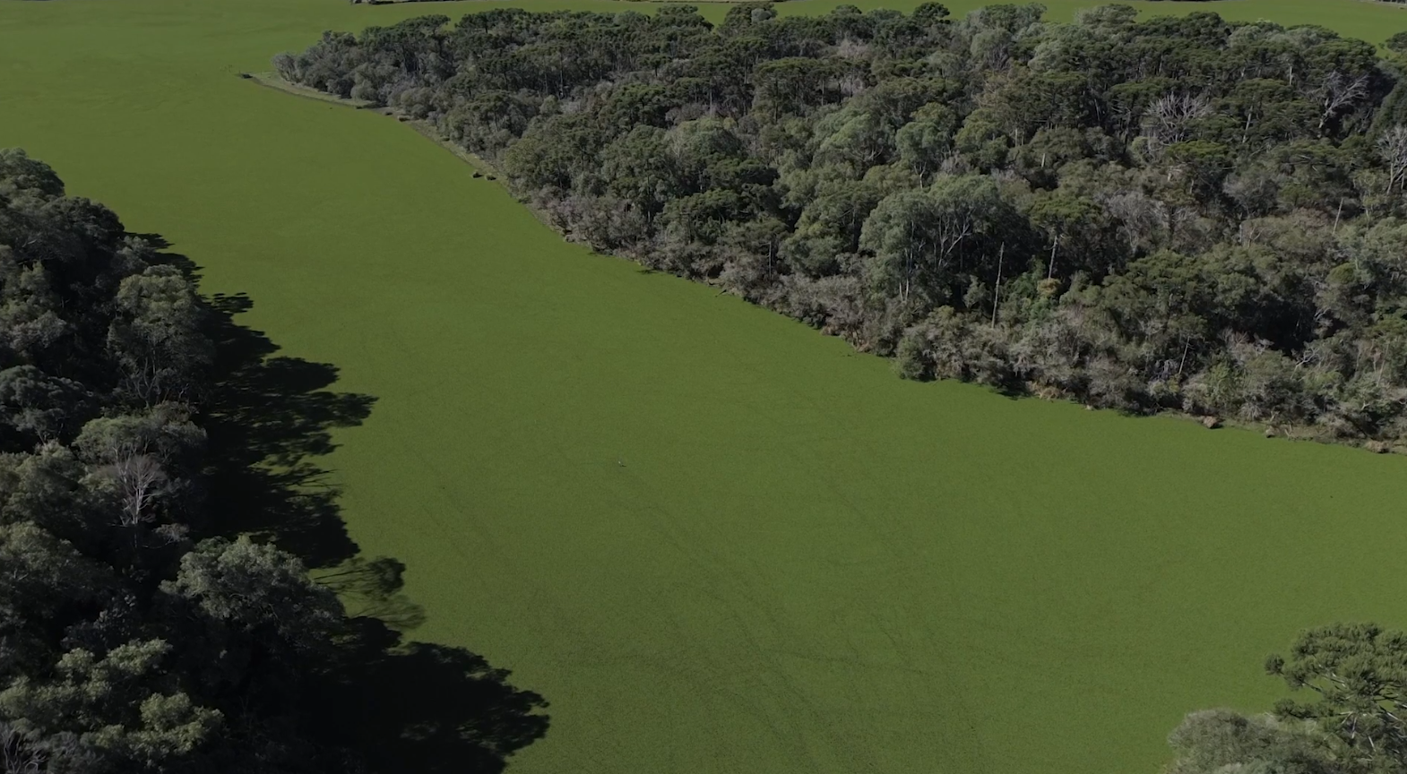 O Ministério Público ajuizou quatro ações civis públicas contra empresas e órgãos públicos por poluição no rio São Lourenço. O curso d’água está coberto por uma camada verde de algas, indicando possível contaminação ambiental.