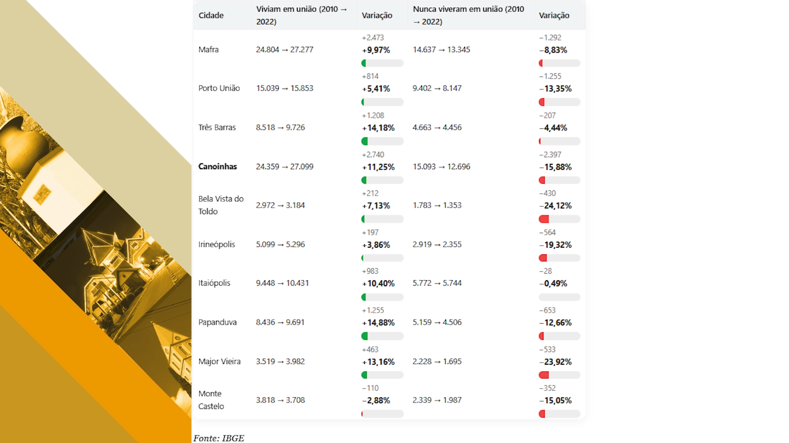 Papanduva (+15%), Três Barras (+14%) e Major Vieira (+13%) registraram os maiores avanços proporcionais de casamentos. Monte Castelo foi a única cidade a destoar da tendência, com queda de 2,8%. Em números absolutos, Mafra lidera com 27.277 pessoas em união, seguido por Canoinhas, que também apresentou crescimento expressivo.